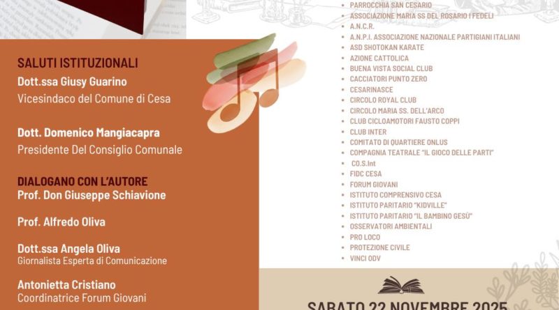 Nel corso dell’appuntamento organizzato dall’associazione culturale “Associazione Casa del Sole”, in sinergia con altri sodalizi, discuteranno con l’autore, don Giuseppe Schiavone, parroco della Chiesa di San Cesario e docente, il professor Alfredo Oliva, la giornalista Angela Oliva, e la coordinatrice del Forum Giovani, Antonietta Cristiano.
