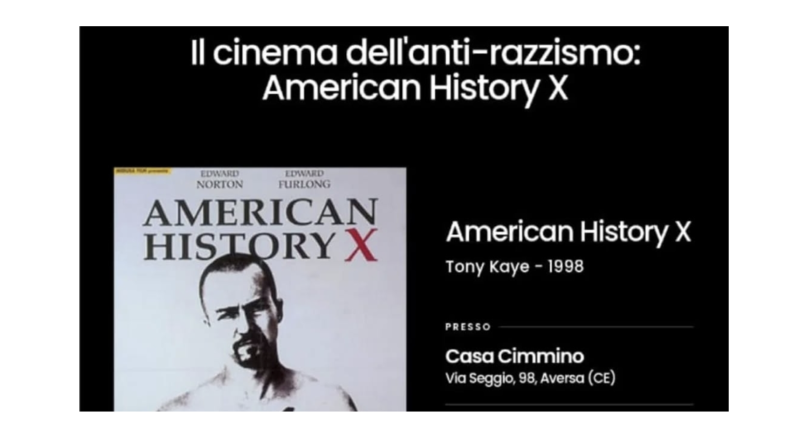 Durante il primo incontro, sarà proiettato “American History X” di Tony Kaye, uscito nelle sale statunitensi nell’ottobre del 1998 basato sulla sceneggiatura di David McKenna. II film è ambientato nella Los Angeles degli anni ’90, scossa dal caso di cronaca del tassista afroamericano Rodney, pestato a morte da quattro agenti, che successivamente furono assolti. Questa assoluzione fece divampare a Los Angeles nel 1992 una serie di rivolte, meglio note come “Rodney King Uprising”.Il collettivo,con la proiezione cinematografica dell’opera prima di Kaye, si propone di riprendere le trame del discorso sul rapporto strutturale tra capitalismo e razzismo a partire dalle vicende dei due fratelli Derek e Danny, il primo, skinhead ex neonazista, e il secondo che vive nel mito del primo. Una sorta di racconto di formazione che ripercorre l’iter di redenzione dei protagonisti con i quali lo spettatore tenta di risalire alle radici dell’odio verso l’altro.