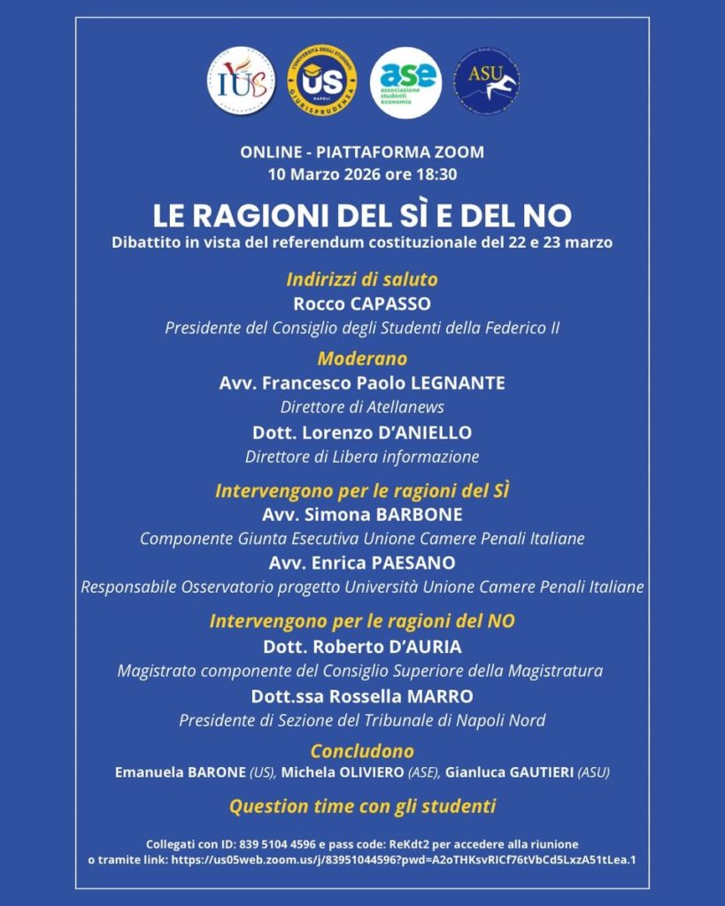 Martedì pomeriggio a partire dalla ore 18:30 la platea studentesca dell'ateneo partenopeo. analizzeranno le ragioni del si e quelle del no nel corso del dibattito organizzato dalle associazioni "US – L’Università degli Studenti" e "IUS - Innovazione Universitaria Studentesca" della Facoltà di Giurisprudenza, da "ASE" di Economia e "ASU "di Scienze Politiche. Ad aprire i lavori sarà il Presidente del Consiglio degli Studenti della Federico II, Rocco Capasso, mentre il confronto, moderato da Francesco Paolo Legnante, Direttore di Atellanews, e da Lorenzo D'Aniello, Direttore di Libera informazione, sarà fra l’Avv. Simona Barbone, Componente Giunta Esecutiva Unione Camere Penali Italiane e l’Avv. Enrica Paesano , Responsabile Osservatorio progetto Università Unione Camere Penali Italiane, per il SI, ed il Dott. Roberto D'Auria, Magistrato componente del Consiglio Superiore della Magistratura e la Dott.ssa Rossella Marro , Presidente di sezione del Tribunale di Napoli Nord, per il No.