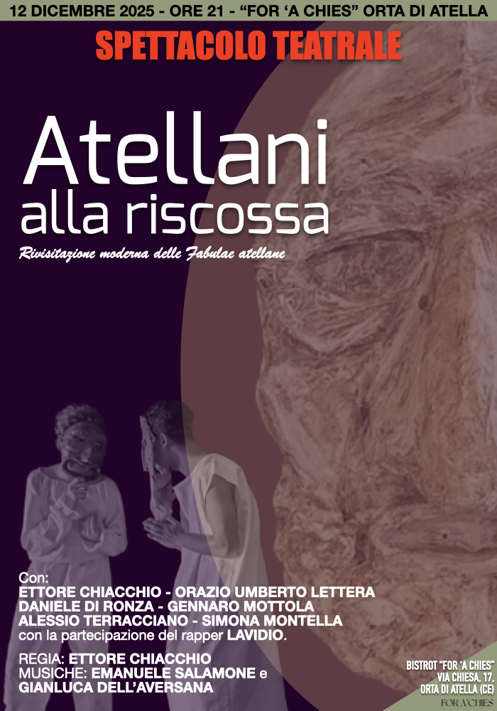 La compagnia “Junior Comic” porterà in scena Atellani alla riscossa, una rivisitazione moderna e brillante delle antiche Fabulae Atellanae, patrimonio fondamentale della tradizione teatrale locale. Lo spettacolo mescola comicità, ritmo serrato e satira alla politica, affidando alle storiche maschere atellane il compito di interpretare, con leggerezza e ironia, dinamiche contemporanee che il pubblico riconoscerà con facilità.