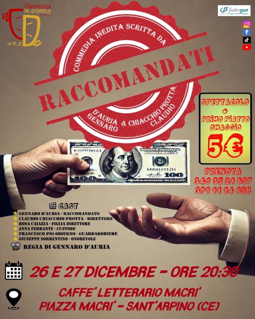 SANT'ARPINO. Il paese si prepara ad accogliere uno spettacolo che promette di far ridere, riflettere e, soprattutto, mettere in discussione alcune delle dinamiche più radicate della nostra società. Il 26 e 27 dicembre, presso il Caffè Letterario Macrì, andrà in scena “Raccomandati”, una rappresentazione teatrale che affonda il bisturi nella cultura della raccomandazione, del favore e delle connessioni che troppo spesso determinano il destino degli individui più del talento e del merito.
