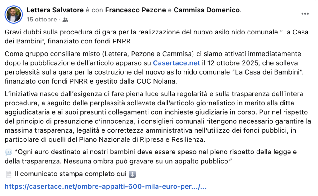 Il 15 ottobre 2025 il consigliere di opposizione scriveva in un post di gravi dubbi sulla procedura di gara per la realizzazione del nuovo asilo nido comunale, così come riporta lo screen del post.
