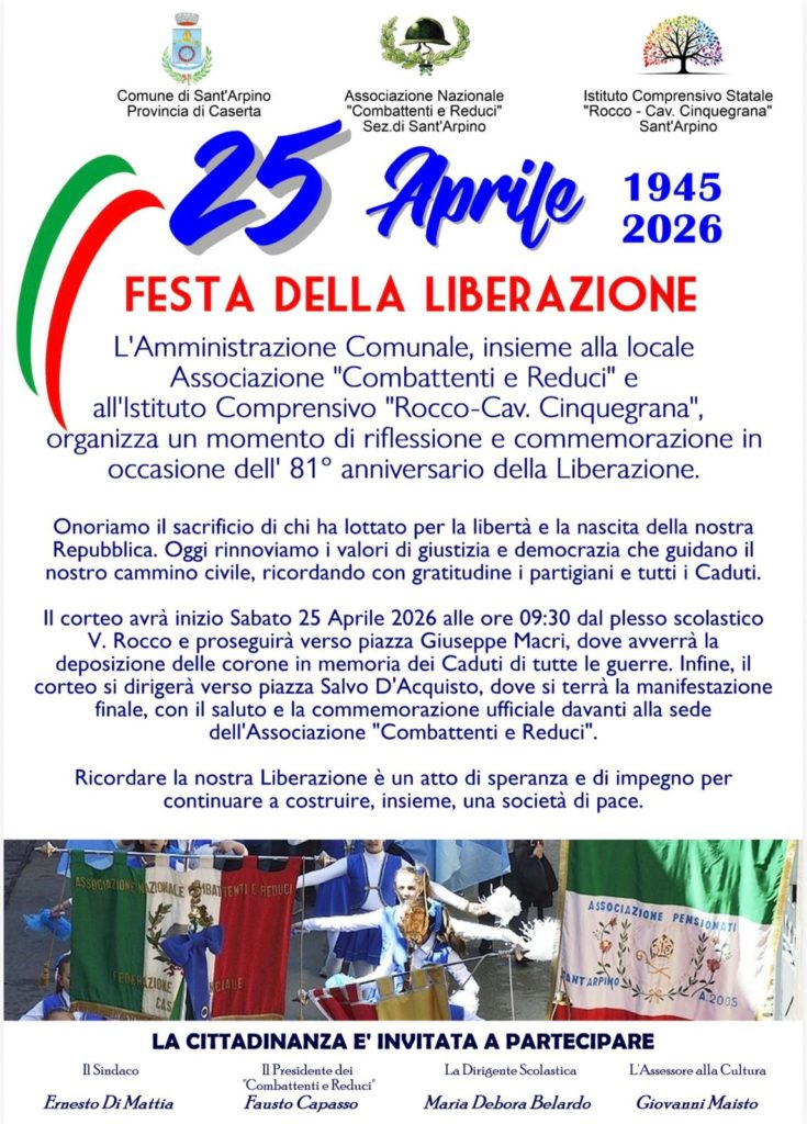 In un tempo segnato da nuove incertezze globali, Sant’Arpino sceglie di rispondere con la forza della memoria e della partecipazione. Perché ricordare la Liberazione, oggi più che mai, non è un gesto rituale: è un atto di resistenza civile, un modo per ribadire che la pace non è mai scontata, ma va costruita ogni giorno, insieme.