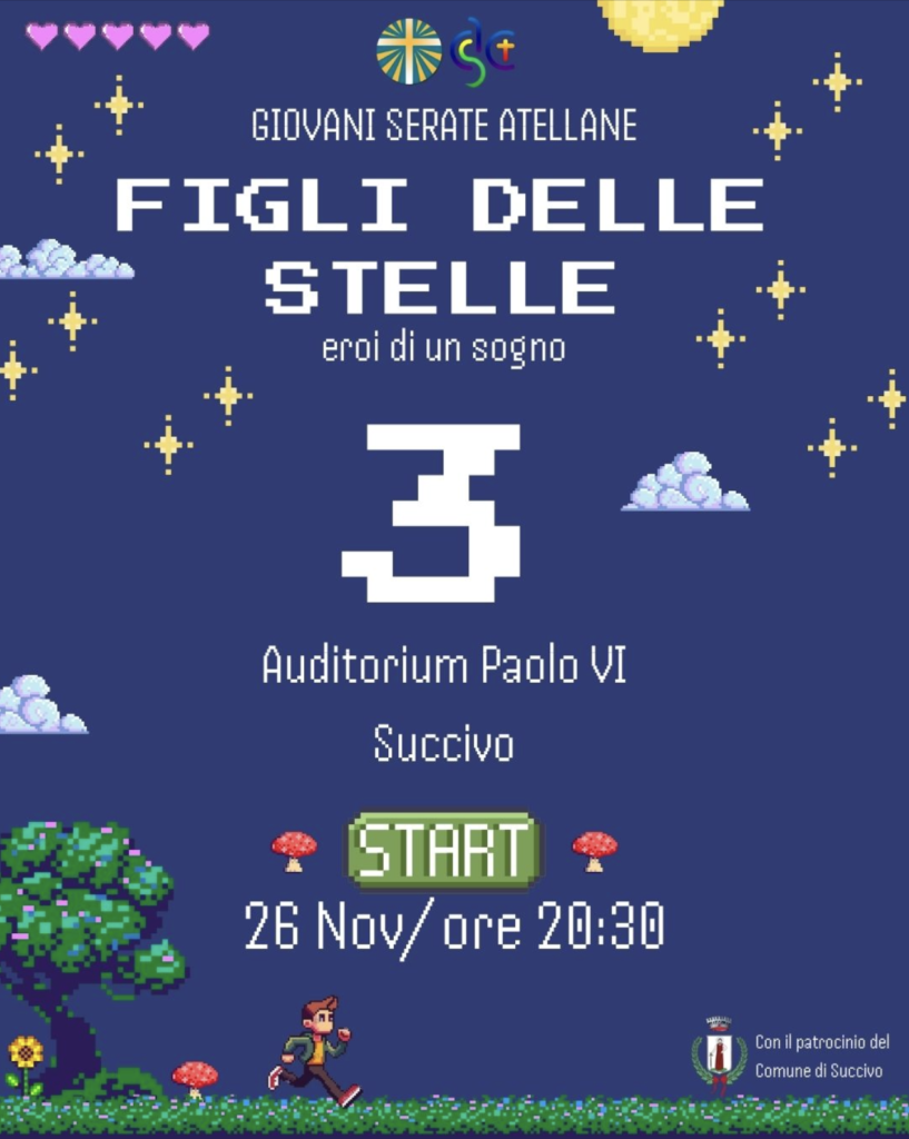 SUCCIVO. Prenderà il via mercoledì 26 novembre alle 20:30 la terza edizione delle Giovani Serate Atellane “Figli delle stelle. Eroi di un sogno”. L'iniziativa, promossa e organizzata dal Settore Giovani dell'Azione Cattolica S. Giovanni Bosco di Succivo, si conferma come un appuntamento centrale per il dialogo e il confronto sui temi emergenti che interessano la realtà giovanile.