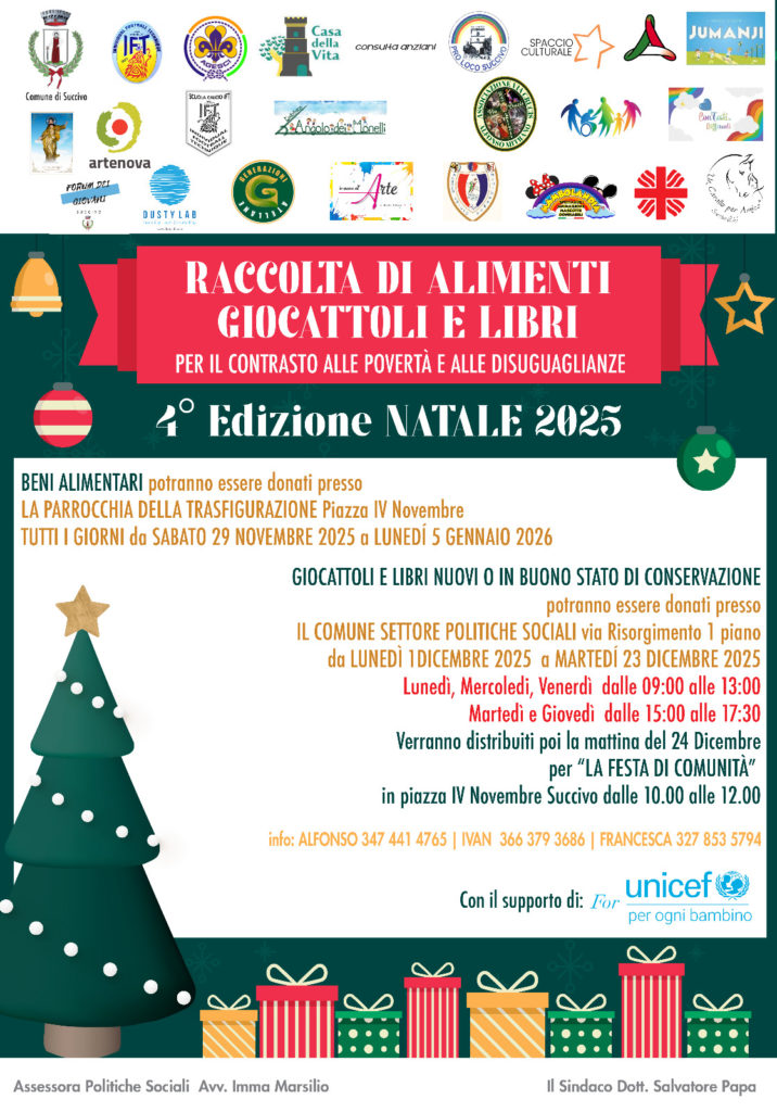 SUCCIVO. Il Comune atellano conferma ancora una volta la propria vocazione solidale e la propria attenzione verso le fasce più fragili della popolazione con la 4ª edizione della Raccolta di viveri, giochi e libri, un’iniziativa che negli anni è diventata un simbolo dell’impegno della comunità nel contrasto alle povertà e alle disuguaglianze. "Siamo orgogliosi di annunciare la nuova edizione di questa iniziativa – si legge nel comunicato del Comune – che rafforza quel senso di comunità che rende Succivo una Città Amica nel vero significato del termine".