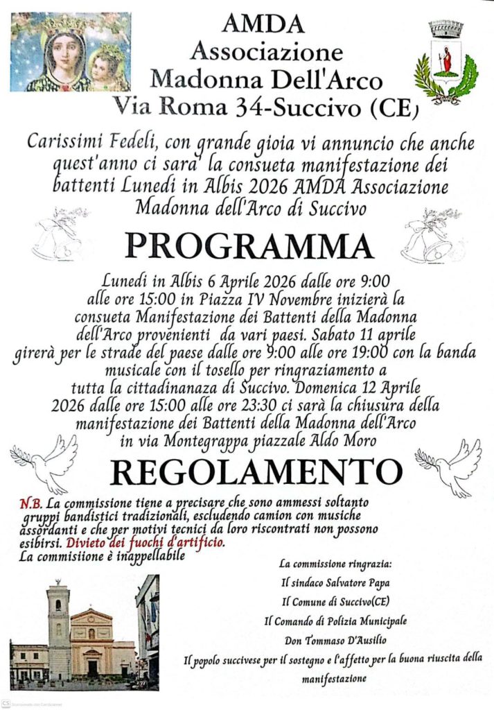 Succivo si prepara alla Festa dell’Associazione Maria Santissima dell’Arco di via Roma: tradizione, devozione e comunità in piazza IV novembre nel giorno di lunedì in Albis